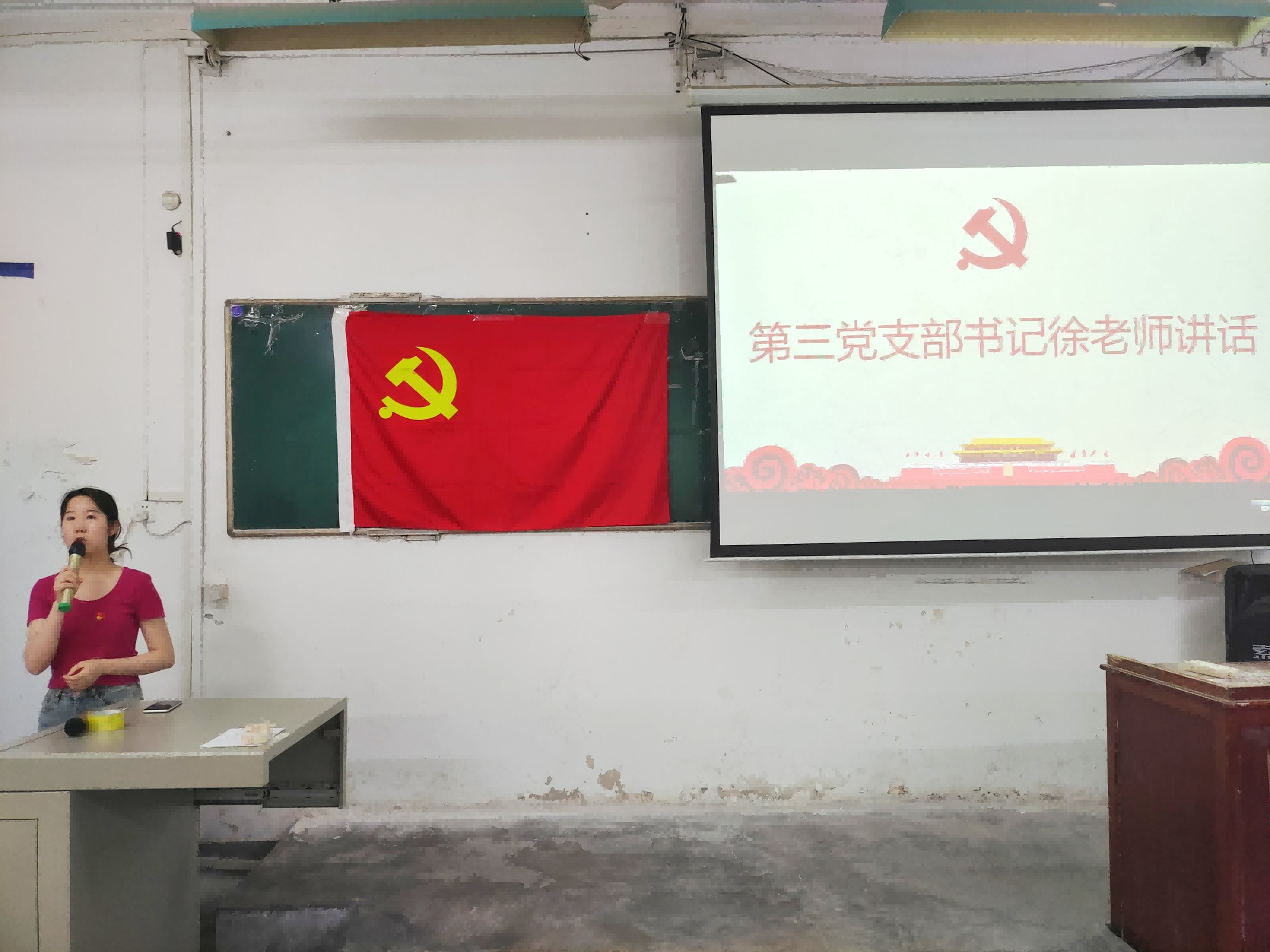 伴随着庄严肃穆的国歌声响起,此次活动拉开了帷幕。在学生党员代表邱添的带领下,全体参会人员齐颂入党誓词。