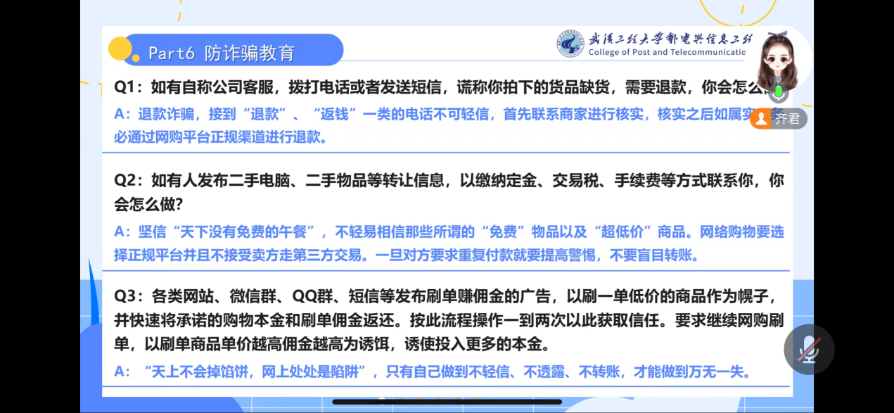 10月13日,新生辅导员张翔结合视频资料和高校大学生各类安全案例为新生们带来了一场生动的安全教育,他重点讲解了校园消防、电信诈骗、校内电动车安全等注意事项,在防范电信诈骗层面,他结合现实案例剖析了常见的诈骗手段,以强化同学们对各类诈骗套路的认识与了解,帮助同学们及时识别、有效防范各种网络诈骗,他还提醒同学们应树立正确的价值观和消费观,避免因贪图小利而陷入诈骗的陷阱,提醒新生们做好个人安全的第一责任人。